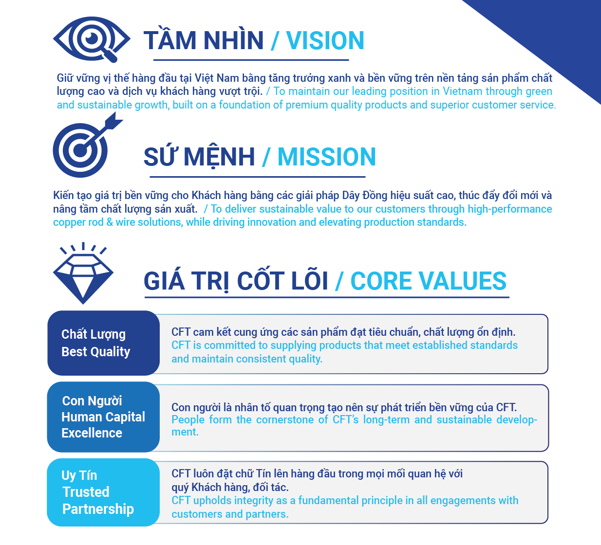 CFT được biết đến là nhà sản xuất dây đồng trần uy tín, chất lượng hàng đầu Việt Nam với kinh nghiệm gần 30 năm sản xuất và cung cấp sản phẩm cho các đối tác là các Công Ty hàng đầu trong lĩnh vực sản xuất dây cáp điện, dây điện từ, dây điện ô-tô trong nước và trên thế giới.