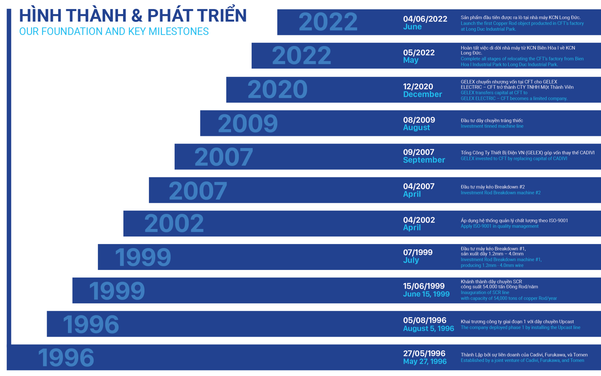 Công ty dây đồng Việt Nam CFT là đơn vị sản xuất dây đồng (Rod/Wire) có uy tín tại Việt Nam, được thành lập vào ngày 27/05/1996, tiền thân là Công ty liên Doanh giữa Công ty Cổ phần dây cáp điện Việt Nam (Cadivi),Furukawa và Toyota Tsusho. Với tầm nhìn đổi mới và sự phát triển bền vững, CFT đã trở thành một trong những công ty hàng đầu về sản xuất dây đồng tại Việt Nam.